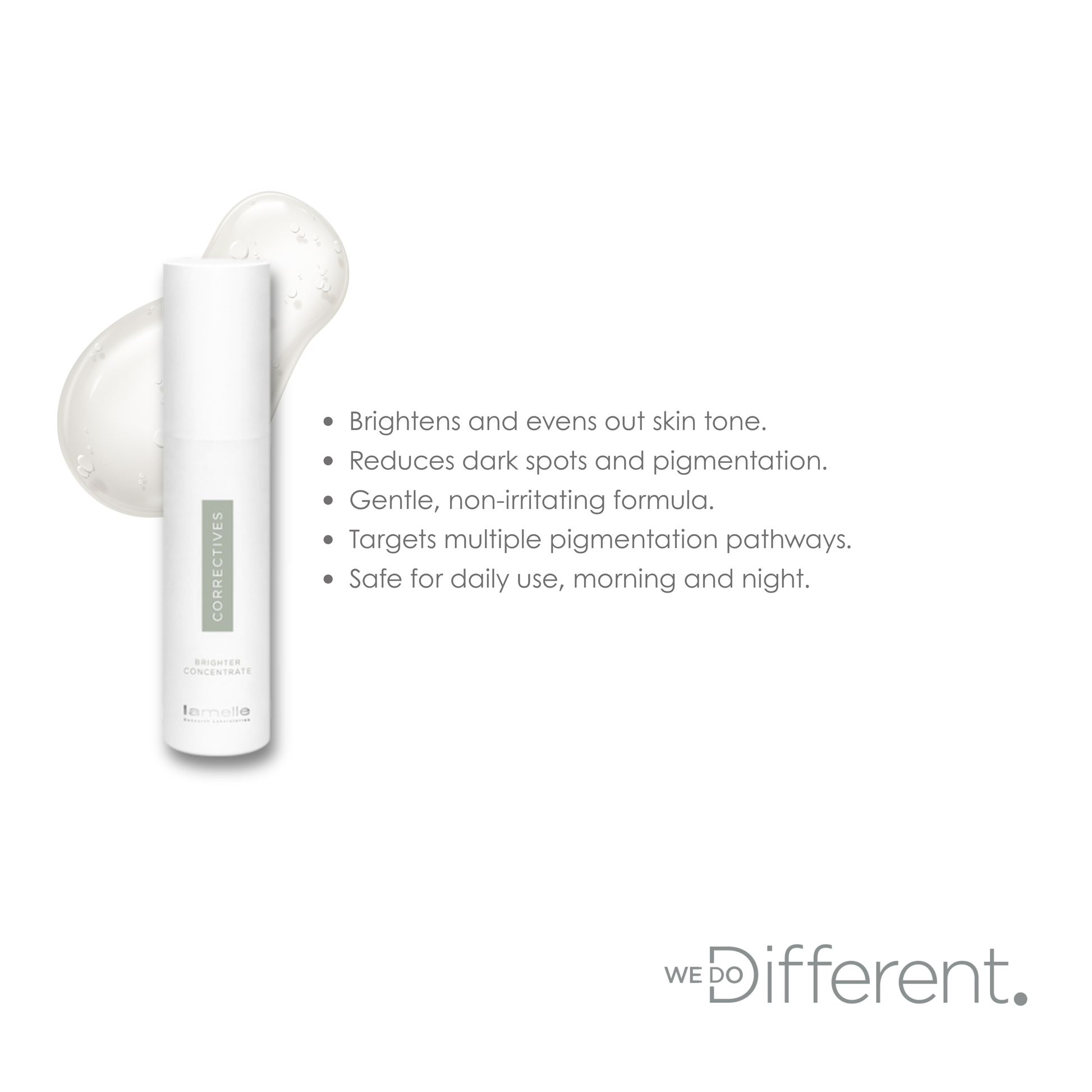 Say goodbye to stubborn dark spots and uneven skin tone with Lamelle Correctives Brighter Concentrate, your new go-to serum for radiant, glowing skin. This gentle yet powerful formula uses a breakthrough ingredient called Deca-Butin (a next-gen form of arbutin) along with four pigment-inhibiting peptides to target the root causes of hyperpigmentation. It works deep within the skin to reduce dark marks, brighten dull areas, and even out your complexion, all without irritation or harsh ingredients. Safe for twice-daily use, it's perfect for anyone looking to treat pigmentation gently but effectively. Reveal visibly brighter, clearer skin.