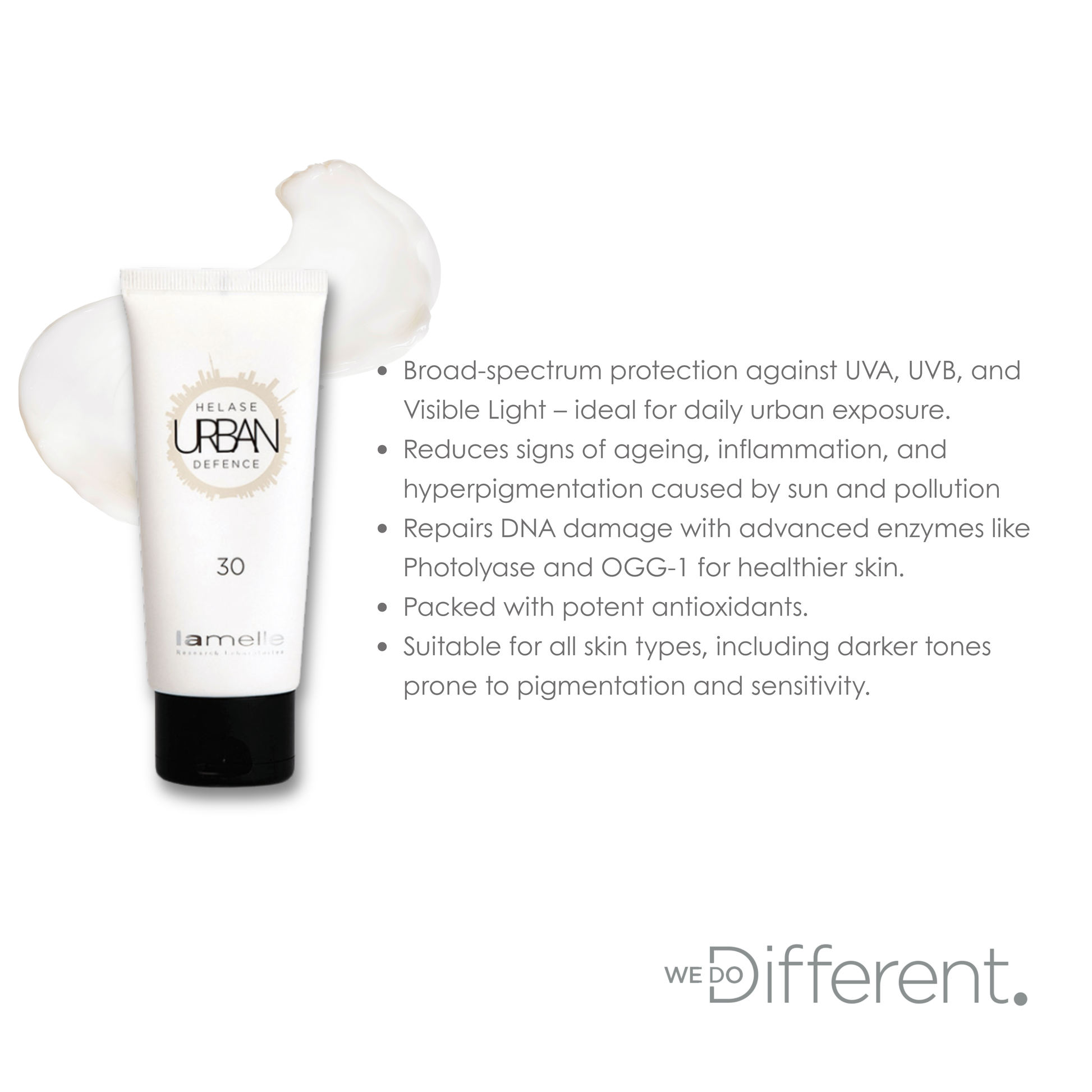 A multi-functional, broad-spectrum sunscreen designed to shield your skin from UVB, UVA, and Visible Light, making it ideal for urban environments. This advanced photo-protector helps reduce signs of ageing, inflammation, hyperpigmentation, and DNA damage caused by sun exposure and pollution. Packed with antioxidants like L-Ergothioneine, DNA-repair enzymes, and AhR inhibitors, it protects and repairs skin at a cellular level. Suitable for all skin types, including darker tones prone to pigmentation. Helase Urban Defence 30 is your essential daily defence against urban pollution and environmental stress.