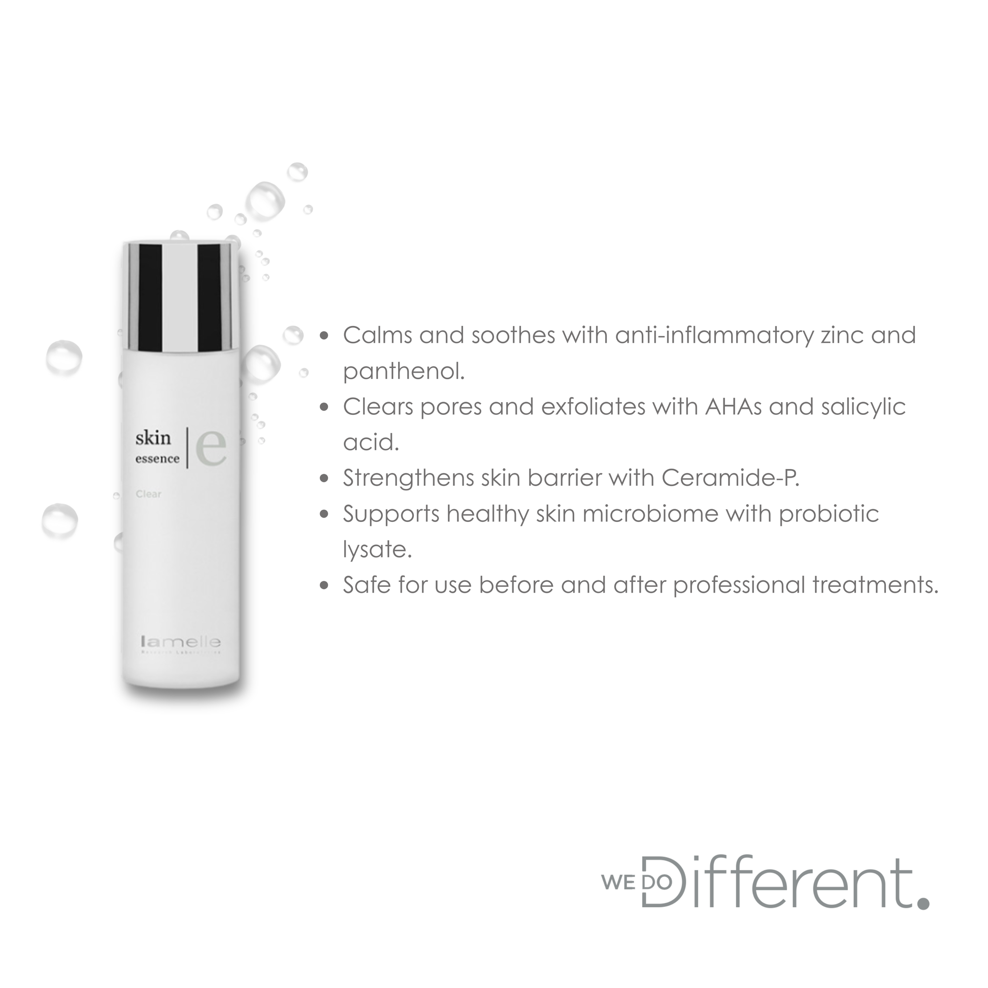Clarify and calm your skin naturally, Skin Essence Clear is a powerful, yet gentle treatment designed to clarify and calm problem-prone skin. Formulated with anti-inflammatory zinc and soothing panthenol, it helps reduce redness and irritation. A blend of alpha hydroxy acids (AHAs) and salicylic acid exfoliates both the skin’s surface and deep within pores, promoting a clearer, smoother complexion. Ceramide-P works to strengthen your skin’s natural barrier, while probiotics support overall skin health. Use twice daily after cleansing to prep your skin for serums, moisturisers, or sunscreen. Safe to use before and after professional treatments, it’s the perfect step for balanced, refreshed skin.